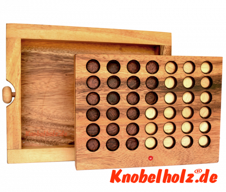 Zuerst muss das Spiel aufgebaut werden. Beim öffnen des Spieles werden die beiden Holzstifte aus dem Holz gezogen um das Spielfeld aus dem Rahmen zu bekommen. Die Öffnungen in die später die Spielsteine eingeworfen werden befinden sich auf der gegenüberliegenden Seite vom rotem Punkt. Achtung Vorsicht der rote Punkt sollte sich , beim herausnehemen des Spieles, unten befinden damit die Spielsteine nicht aus dem Spielfeld unkontrolliert herausfallen. Die Spielsteine können nach dem herausnehmen dann kontrolliert, auf dem Tisch , ausgeschüttet werden. Das Spielfeld wird, nach dem es aus dem Rahmen genommen wurde mit dem roten Punkt nach unten in den Rahmen wieder eingesetzt so das der Rahmen jetzt als Fuß dient. Die beiden Holzstifte werden als Sicherung wieder in die Seite des Rahmens gesteckt. Jeder Spieler gibt seine Spielsteine auf seiner Seite des Spielfeldes in die entstandene Schale und das Spiel kann beginnen.