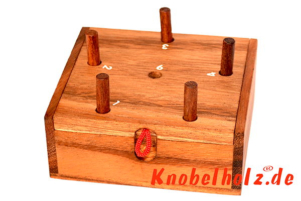 Lustiges Unterhaltungsspiel für zwei und mehr Personen jeden Alters. So geht's: Die vielen kleinen Holzstäbchen in der Kiste werden auf alle Spieler gleich verteilt. Ziel ist es, alle Holzstäbchen wieder loszuwerden. Würfelt man eine 6, so kann das Stäbchen im mittleren Loch versenkt werden. Die Steckfächer 1-5 jedoch lassen die Stäbchen stehen und das Feld ist besetzt.  Würfelnd werden die Felder des Spielbretts entsprechend der Augenzahlen besetzt.  Ist ein Feld bereits besetzt, muss der Spieler den Stab nehmen, und der Nächste ist dran. Wer keine Holzstäbe mehr hat, ist Sieger. Ja bald werden Sie wissen, warum das Spiel "Warum immer ich?" heißt!