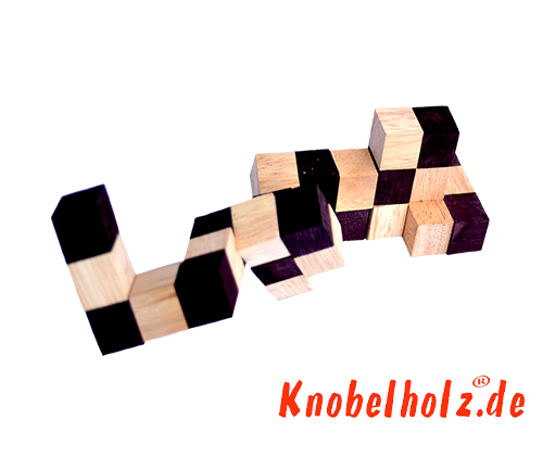 The snake cube consists of a chain with 27 wooden cubes made of Samanea wood. The cubes are connected by a rubber band running in the middle. They form different two or three groups in a special arrangement showing the photo above. The objective of the puzzle is to place the cube chain so that a 3x3x3 cube is created. If you have the two photos with your Snake Cube after make can then continue with the next 2 photos of the instructions to the Snake Cube of the level box.