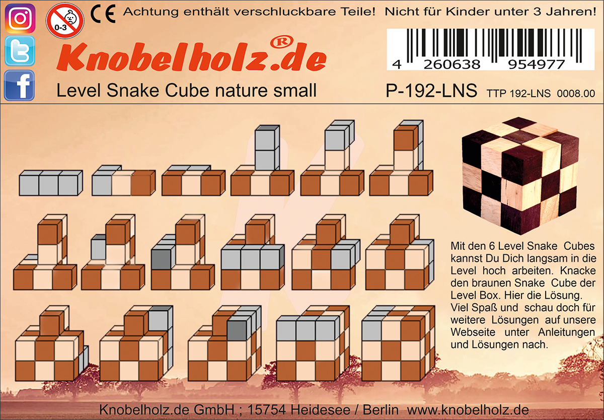 If you have the entire collection of the 6 levels of the Snake Cube Level Box as a wooden puzzle, then try all Snake Cubes and try to solve them alone. If you do not get all the snake cubes back together to a dice, there are our instructions and suggested solutions for how to solve our puzzle in every game and puzzle. If the solutions are not enough to solve the Snake Cube puzzle then use our instructions and solutions on our website, like this one here. Have fun with the wooden puzzle in 2D and 3D. If necessary, you can order the individual Snake Cubes of the Level Box individually or you can put the whole collection of the 6 variations of the 6 Level Box and possibly start your wooden puzzle collection.