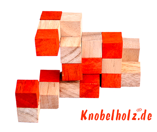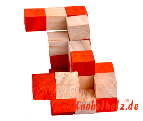 The snake cube consists of a chain with 27 wooden cubes made of Samanea wood. The cubes are connected by a rubber band running in the middle. They form different two or three groups in a special arrangement showing the photo above. The objective of the puzzle is to place the cube chain so that a 3x3x3 cube is created. If you have the two photos with your Snake Cube after make can then continue with the next 2 photos of the instructions to the Snake Cube of the level box.