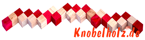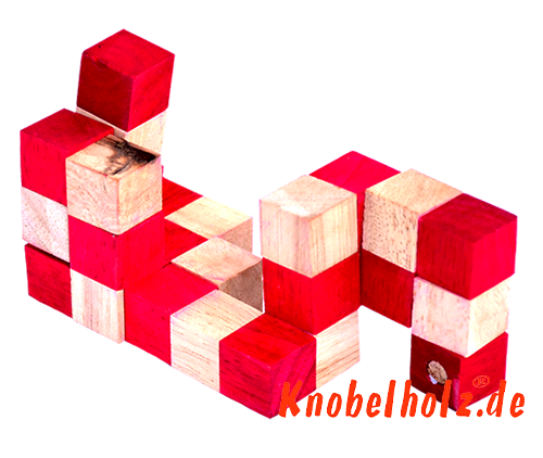 The snake cube consists of a chain with 27 wooden cubes made of Samanea wood. The cubes are connected by a rubber band running in the middle. They form different two or three groups in a special arrangement showing the photo above. The objective of the puzzle is to place the cube chain so that a 3x3x3 cube is created. If you have the two photos with your Snake Cube after make can then continue with the next 2 photos of the instructions to the Snake Cube of the level box.