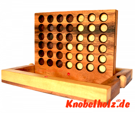Игра воспроизводится на вертикальном, полом, деревянном устройстве, в которое игроки поочередно бросают свои плитки в верхнюю часть. Игровое поле состоит из 7 вертикальных колонок и 6 горизонтальных линий. У обоих игроков есть 21 одинаковая цветная плитка. Когда игрок бросает кусок в столбец, он занимает самое низкое доступное пространство в столбце. Каждый игрок представлен его цветом (например, коричневым для первого игрока и желтым для второго). Он воспроизводится поочередно. Цель игры - иметь четыре части своего цвета подряд. Эта строка может быть вертикальной, горизонтальной или диагональной. Вы можете сделать это, поставив камни один за другим в семи возможных столбцах. Камни падают на самое низкое возможное свободное пространство d. H. либо на землю, либо на другой камень.